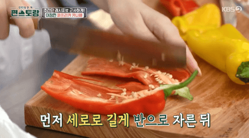 2. 파프리카를 세로로 길게 반 자른 뒤 씨를 제거해 줍니다.