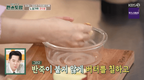 7. 내열 용기에 밑면과 옆면에 버터 10g을 발라줍니다.