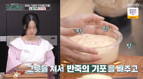 11. 반죽 윗면을 고르게 펴고, 용기 바닥을 살짝 쳐서 기포를 빼줍니다.