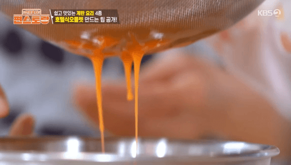 4. 달걀물을 체에 걸러줍니다.(계란의 알끈을 제거하면, 더 부드러운 식감을 낼 수 있습니다.)