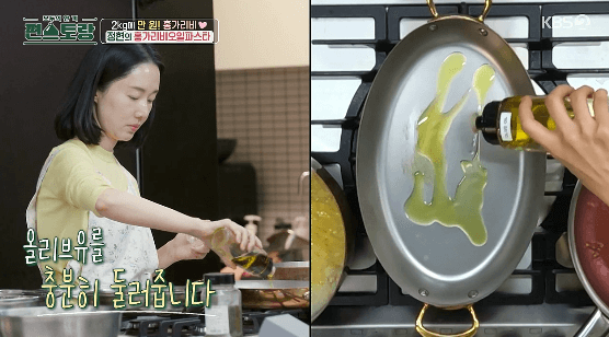 3. 팬을 예열하고, 올리브유를 넉넉하게 둘러줍니다.