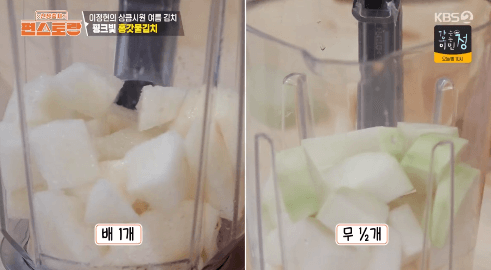 10. 배 1개는 껍질을 벗기고, 적당한 크기로 잘라 믹서기에 넣습니다.
