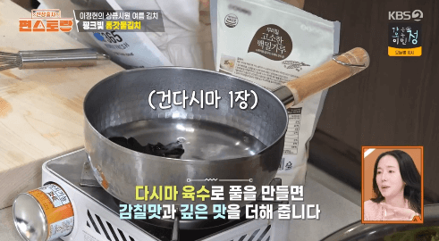 5. 냄비에 물 700ml, 건다시마 1장을 넣고 강불에서 바르르 끓여줍니다.