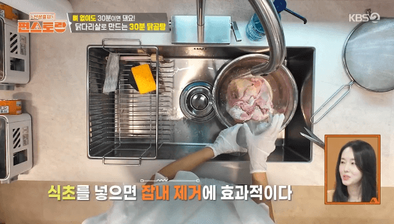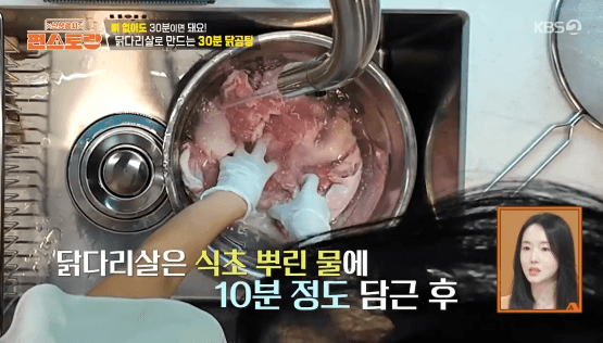 1. 닭다리살에 식초를 뿌리고, 10분간 물에 담가둡니다. (식초를 뿌리면 잡내 제거에 도움이 됩니다.)