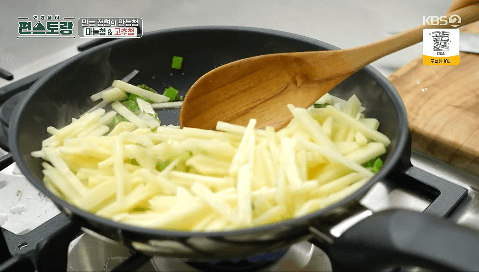 4. 채 썬 감자를 넣고 3분 정도 볶습니다.
