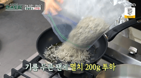 3. 기름을 두룬 팬에 멸치를 넣습니다.