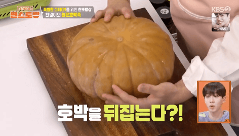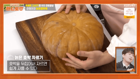 1. 늙은 호박은 젖은 행주로 가볍게 닦은 뒤 뒤집어줍니다.