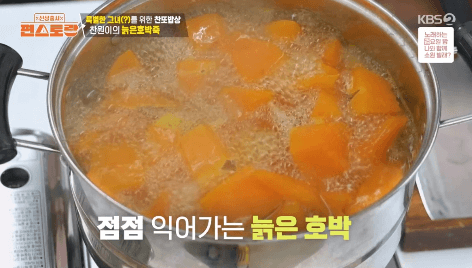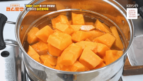 9. 호박씨와 태좌를 삶았던 물에 썰은 호박을 넣고 강불에 10분간 삶습니다.