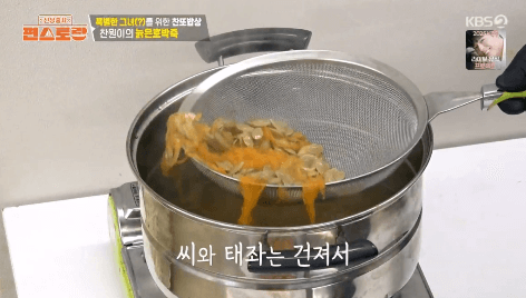 5. 20분 뒤 씨와 태좌를 체로 건져내고, 호박물은 냄비에 놔둡니다.