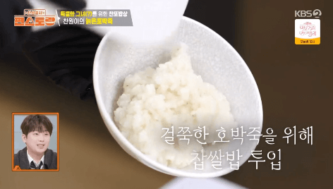 10. 10분 뒤 물이 팔팔 끓으면 찹쌀밥 200g을 넣고, 중불에서 20분간 끓여줍니다. (호박이 타지 않도록 중간중간 바닥을 긁어가며 저어줍니다.)