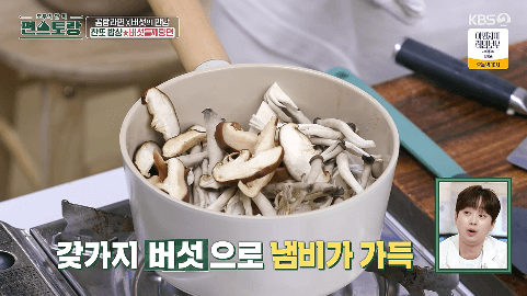 6. 불린 표고버섯, 생표고버섯, 새송이버섯, 느타리버섯, 팽이버섯 등 손질해 놓은 버섯을 냄비에 넣습니다. 버섯이 노릇해질 때까지 중불에서 볶아줍니다.