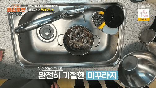1. 대야에 미꾸라지와 굵은소금 한 줌을 넣고, 뚜껑을 덮습니다. 30분 정도 그대로 둡니다.