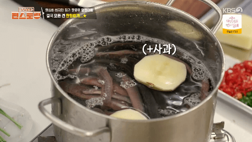 4. 냄비에 미꾸라지, 물 2.2리터를 넣습니다. 사과를 잘라서 넣고 강불에 30분 끓여줍니다. (미꾸라지를 국자로 눌렀을 때 부드럽게 으깨질 정도로 푹 고아줍니다.)
