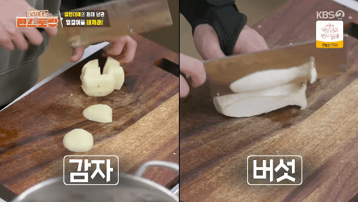 6. 감자 2개는 깍둑썰기, 새송이버섯 2개를 세로로 썰어줍니다.
