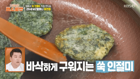 11. 프라이팬에 들기름을 두르고, 달궈지면 쑥떡을 앞뒤로 노릇하게 7분 정도 구워줍니다.