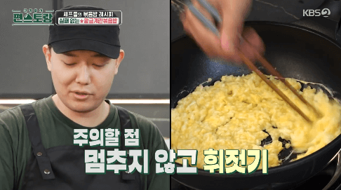 6. 달구지 않은 팬에 계란죽을 넣고, 강불에서 볶아줍니다. 나무젓가락으로 계속 휘저어가며 볶아줍니다.