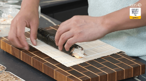 7. 김 발을 돌돌 말아 모양을 잡고, 물이 빠질 때까지 약 10분 정도 놔둡니다.