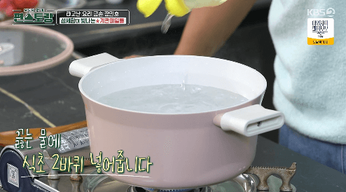 3. 냄비에 물을 가득 끓인 뒤 식초를 2바퀴 넣습니다.