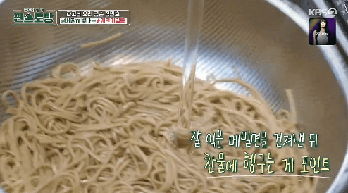 1. 끓는 물에 메밀면 200g을 3분간 삶은 뒤 찬물에 헹궈줍니다. 체에 밭쳐서, 물기를 잘 빼줍니다.