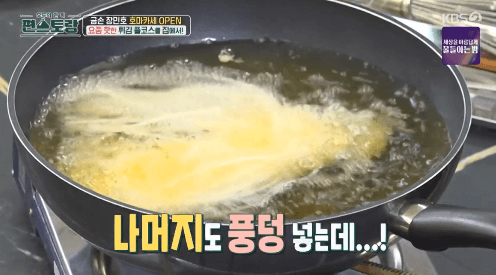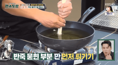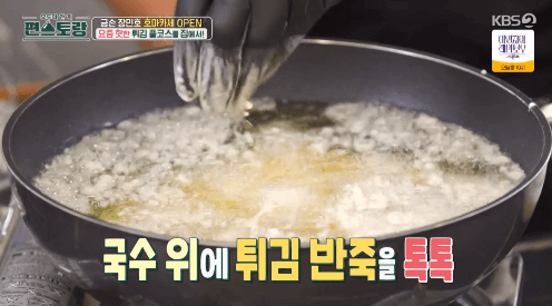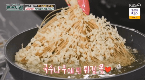 이번 방송에서는 장민호씨가 여러 가지 튀김을 만들었습니다. 가장 먼저 만든 요리가 국수튀김인데요. 조금 생소할 수도 있지만, 말 그대로 국수를 튀긴 요리입니다. 국수도 튀김물을 묻혀서 튀기면 맛있고, 그 위에 다른 요리를 올려서 또 다른 요리의 접시처럼 활용이 가능하다고 합니다.