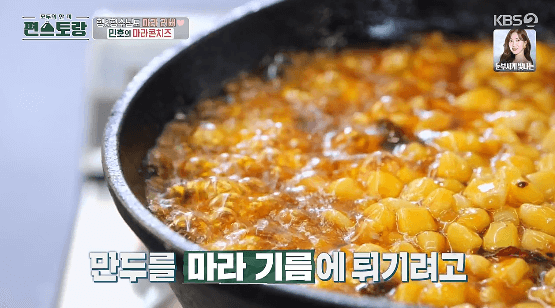 6. 마요네즈와 마라 기름에 옥수수가 튀겨집니다.