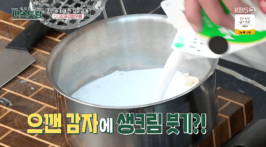 3. 으깬 감자에 생크림 200ml를 부어줍니다.