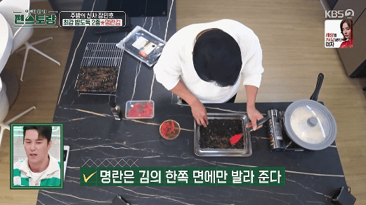 예전에는 기껏해야 김자반이나 튀각 정도였는데, 요즘은 김도 다양하게 조리되어 제품으로 나옵니다. 그중에 장민호씨가 명란김을 좋아한다고 하는데. 이걸 직접 만든다고 하는데요. 어떻게 만드는지 알아보겠습니다. 급하게 먹고 싶을 때, 재료가 있다면 사러 가거나 인터넷으로 주문할 시간에 하나 만들어 먹어도 될 것 같아요.