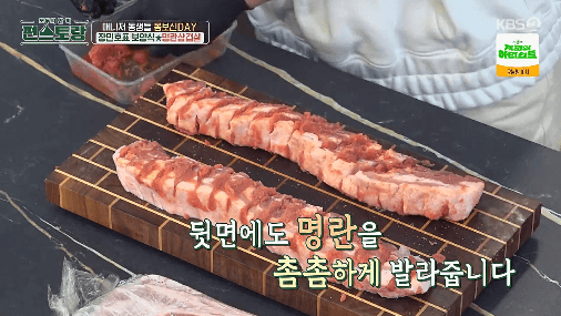장민호씨는 명란을 정말 좋아하는데요. 이 명란을 삼겹살과 같이 구운 명란삼겹살을 만든다고 합니다. 구운 명란의 알이 톡톡 씹히면서 삼겹살도 간이 배어 맛있겠네요. 간단하니까 어떻게 만드는지 따라 해 보세요.