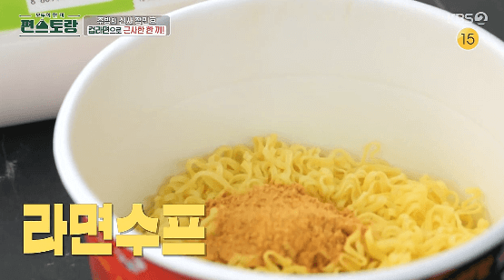 1. 컵라면에 수프를 넣습니다.