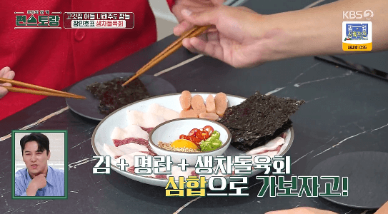 6. 김 위에 명란과 차돌육회, 양념을 올려서 싸 먹습니다.
