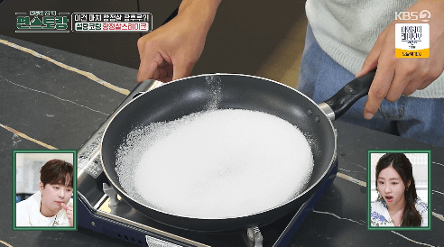 8. 새 팬을 뜨겁게 달군 뒤, 설탕 5큰술을 넣습니다. 중약불에서 설탕을 젓지 말고 팬을 돌려가면서 녹여줍니다.