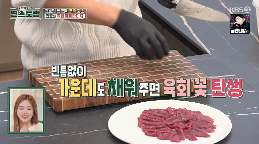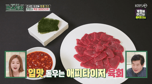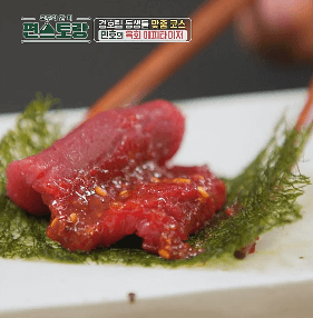 장민호씨가 소고기 우둔살로 육회를 만들었는데요. 우둔살을 회로 뜨고, 양념장에 찍어서 감태에 싸 먹는 방식입니다. 맛있는 양념장을 만들어 육회를 찍어 먹어요.