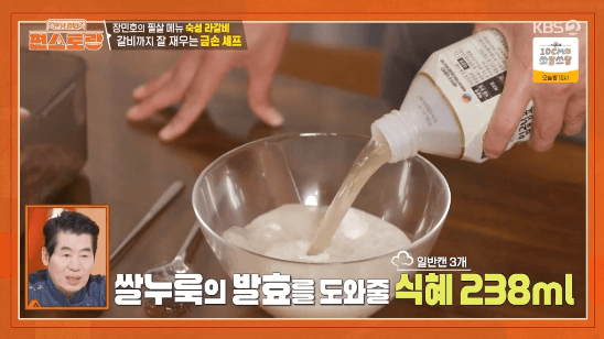 2. 넓은 그릇에 쌀누룩가루 5큰술, 식혜 3캔을 넣고 잘 섞어줍니다.