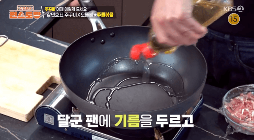 9. 달군 팬에 식용유를 두르고, 오돌뼈 200g을 넣고 볶아줍니다.