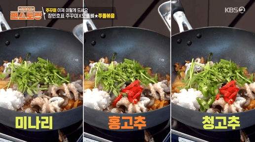 12. 데친 주꾸미, 미나리, 홍고추, 청양고추를 넣고 강불에서 3분간 볶아줍니다. (주꾸미가 질겨질 수 있으므로 3분 정도만 볶아줍니다.)