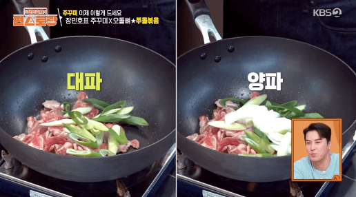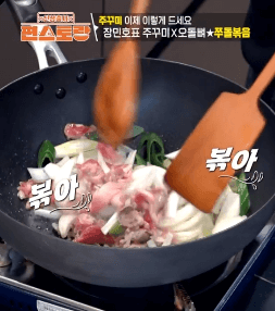 10. 고기가 노릇해자면, 양파, 대파를 넣고 함께 볶아줍니다.