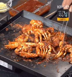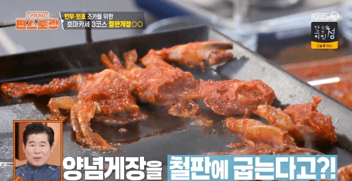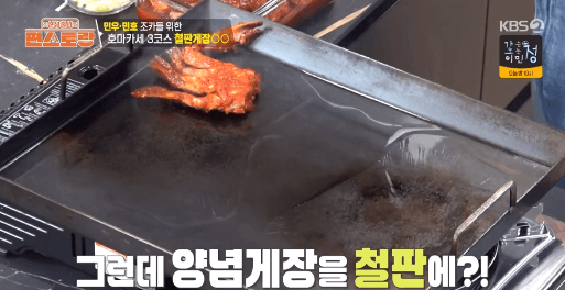 4. 양념게장을 철판에 올리고, 중불에서 구워줍니다. (프라이팬에서 요리해도 됩니다.)