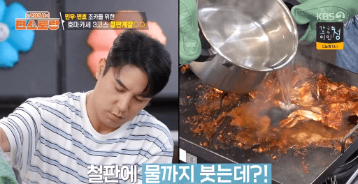 6. 철판 한쪽으로 꽃게를 옮기고, 철판에 끓는 물 1.5리터를 부어줍니다.