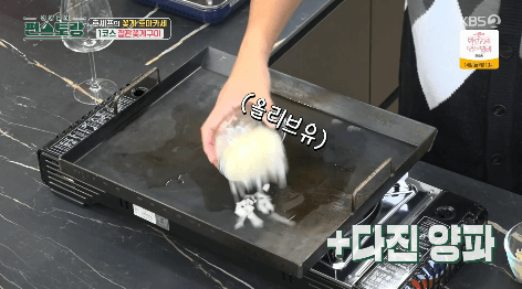 9. 달군 철판에 올리브유를 둘러줍니다. 다진 양파와 마늘을 넣고 노릇하게 볶아줍니다.
