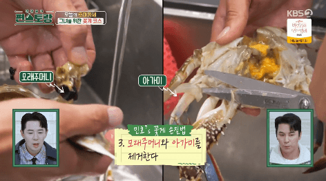 3. 꽃게 입부분에 가위를 대고 등딱지를 벌립니다.