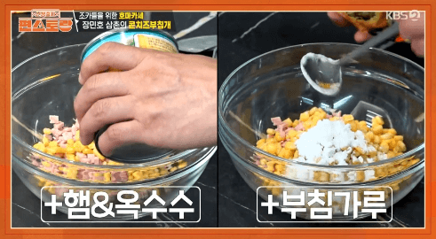 3. 볼에 스위트콘, 잘게 썬 스팸, 부침가루 6큰술을 넣습니다.