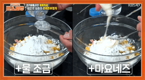 4. 물 5큰술, 마요네즈 1큰술을 넣고 골고루 섞어서 반죽을 만듭니다.
