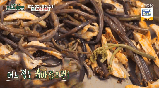5. 시판용 닭가슴살과 자숙 고사리 한주먹을 넣고 센 불에서 빠르게 볶아줍니다.