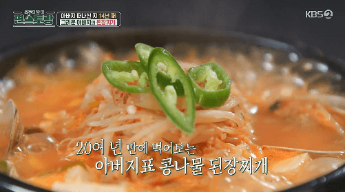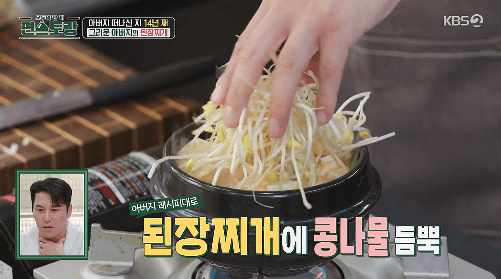 장민호씨가 아버지를 그리워하며 아버지가 끓여주시던 된장찌개 맛을 재현해 보았습니다. 콩나물이 들어가는 게 특징입니다. 맛있는 추억의 된장찌개 끓이는 레시피 알아볼게요.