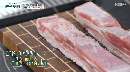 3. 고기를 다시 뒤집어서 오겹살이 위로 오도록 놓습니다.
