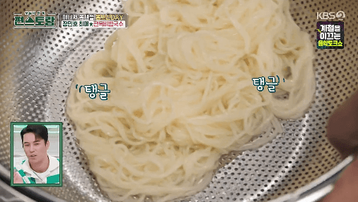 9. 찬물에 헹궈줍니다. 장민호씨는 얼음물에 면을 헹군 뒤 건져서 사용했습니다.
