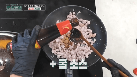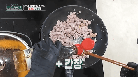 4. 고기가 노릇해지면, 간장 2큰술을 팬 가장자리에 붓고 태워서 불향을 입혀줍니다.