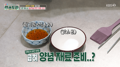 1. 볼에 들기름과 식용유를 붓고 섞습니다. 다른 볼에 맛소금을 담습니다.