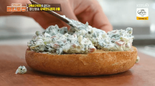9. 베이글에 그릭요구르트소를 바르고, 베이글 뚜껑을 덮어줍니다.