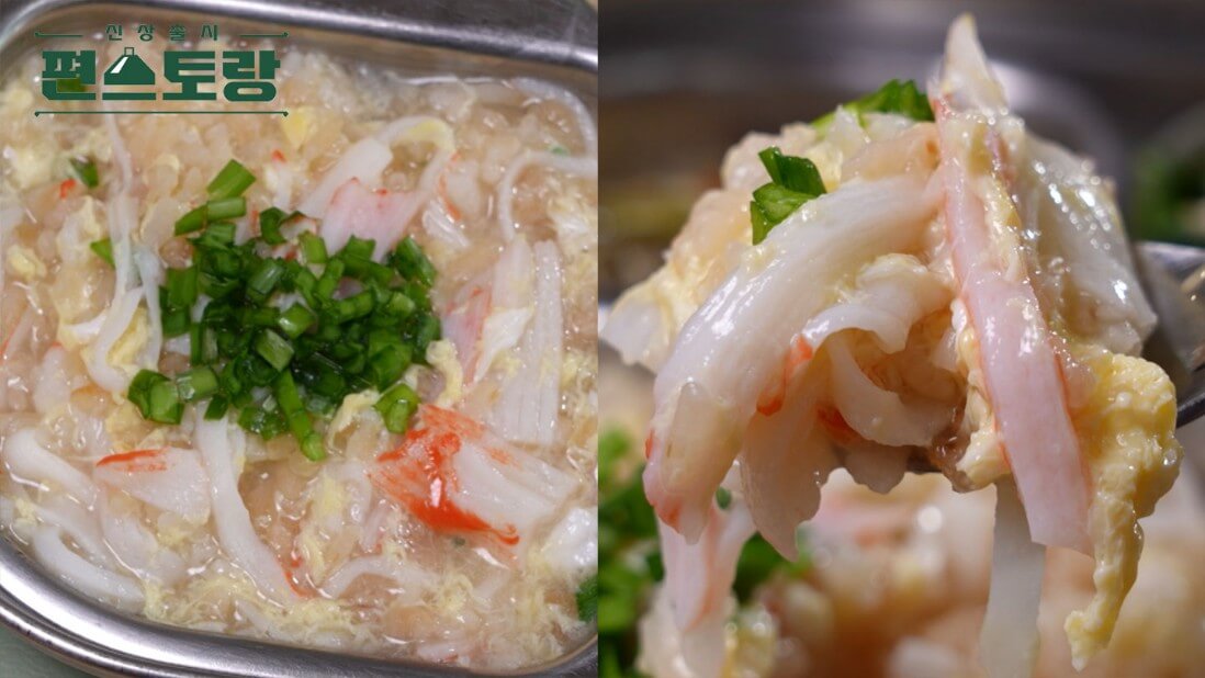 6. 강불로 올리고, 손질한 팽이버섯과 크래미, 소금을 넣고 저어가며 1분 30초 동안 끓여줍니다.